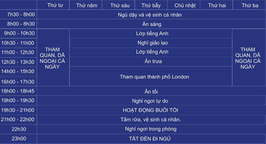Lịch trình hoạt động trong ngày của các hội viên tham gia Trại hè Vương Quốc Anh 2023:
